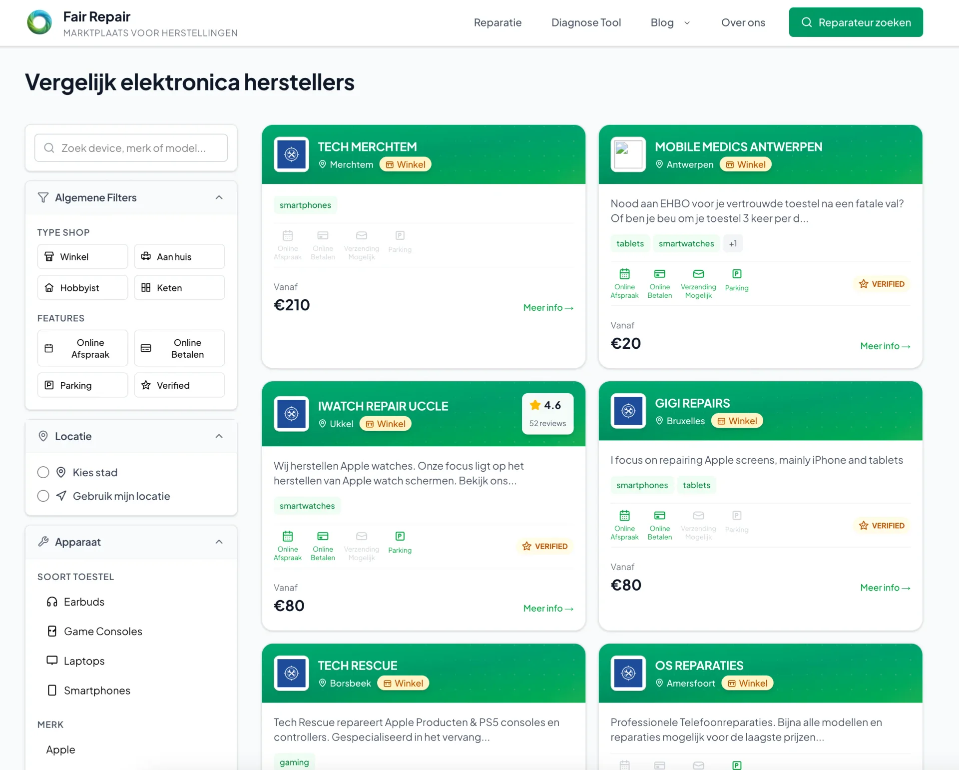Of je nu een smartphone met een gebarsten scherm hebt of een laptop met waterschade — via Fair-Repair vind je snel de juiste specialist.