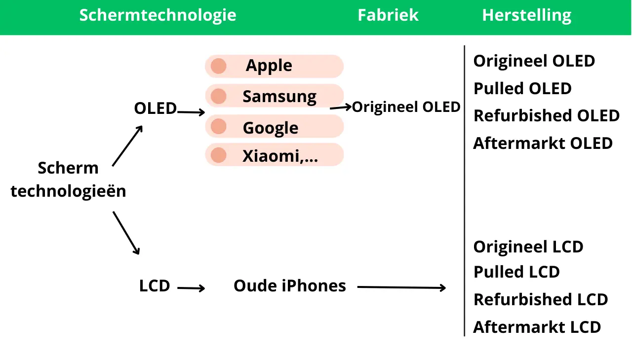 Hieronder vind je de belangrijkste types schermen die gebruikt worden bij herstellingen. Dit overzicht helpt je de kwaliteit te vergelijken.